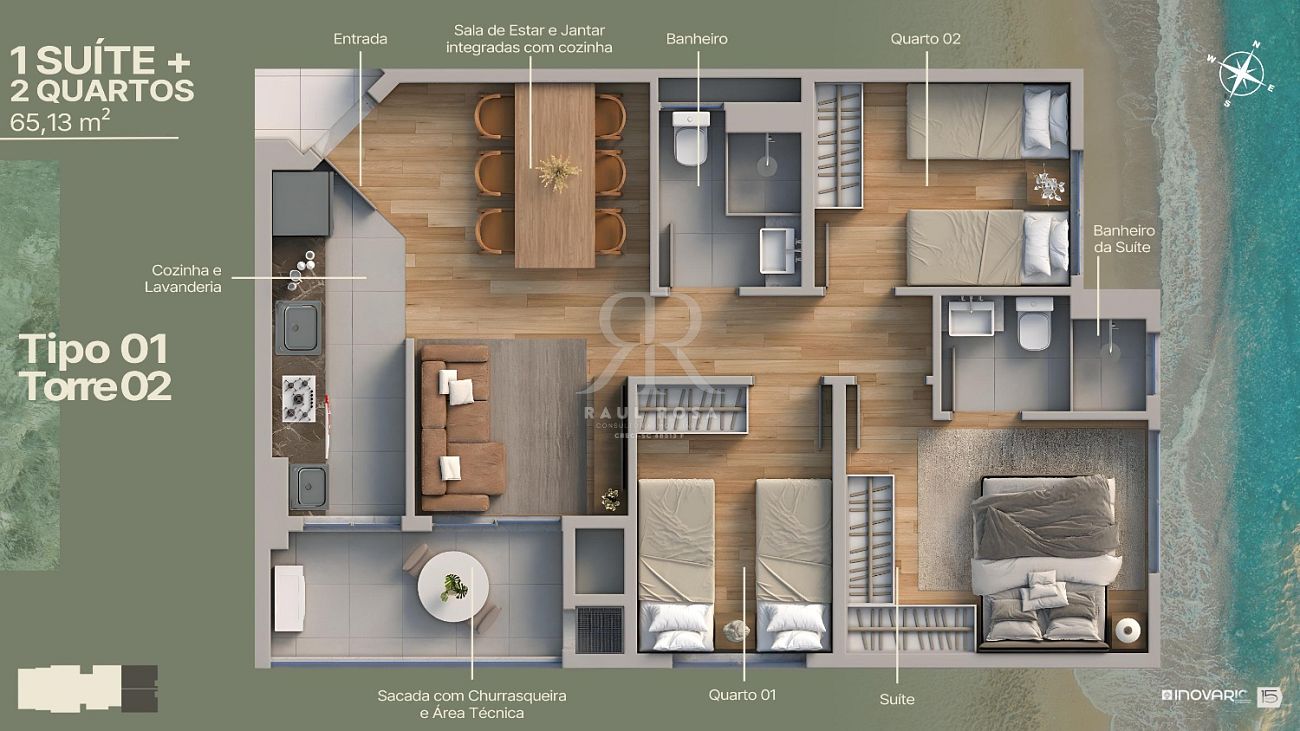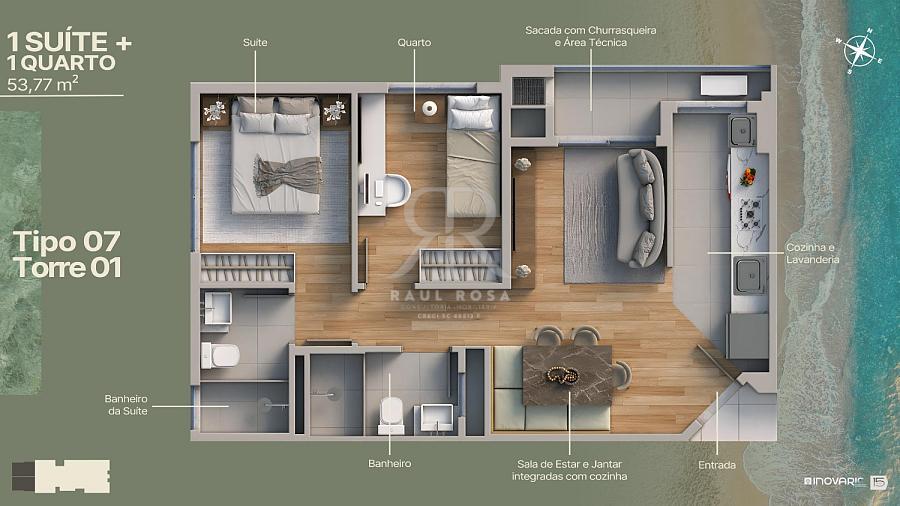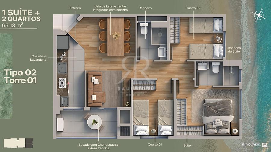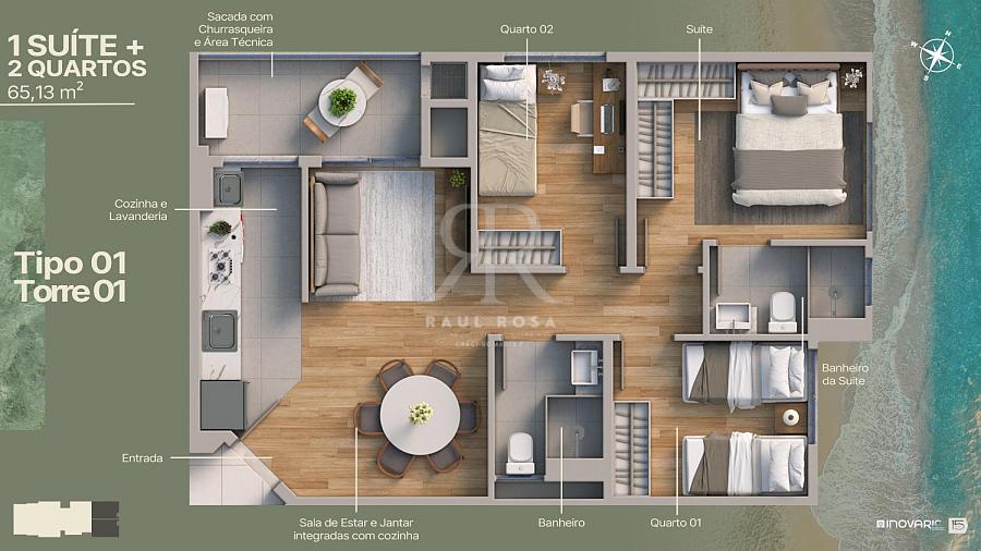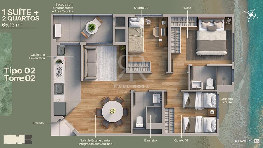 Os apartamentos possuem plantas inteligentes de 53 m² a 65 m² privativos, todos com suítes, sacada com churrasqueira, piso cerâmico 60x60 e infraestrutura para ar-condicionado.